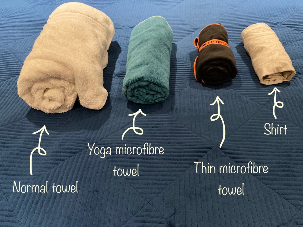 Here’s a comparison between a normal towel, the first yoga microfibre I bought (I didn’t know any better), a thin microfibre towel, and a rolled shirt.